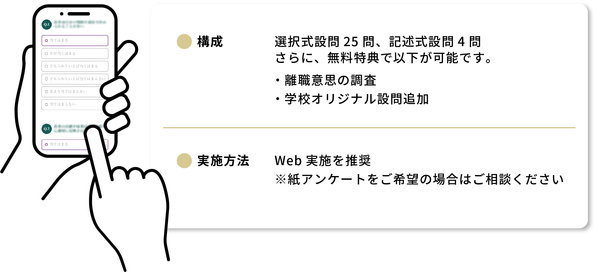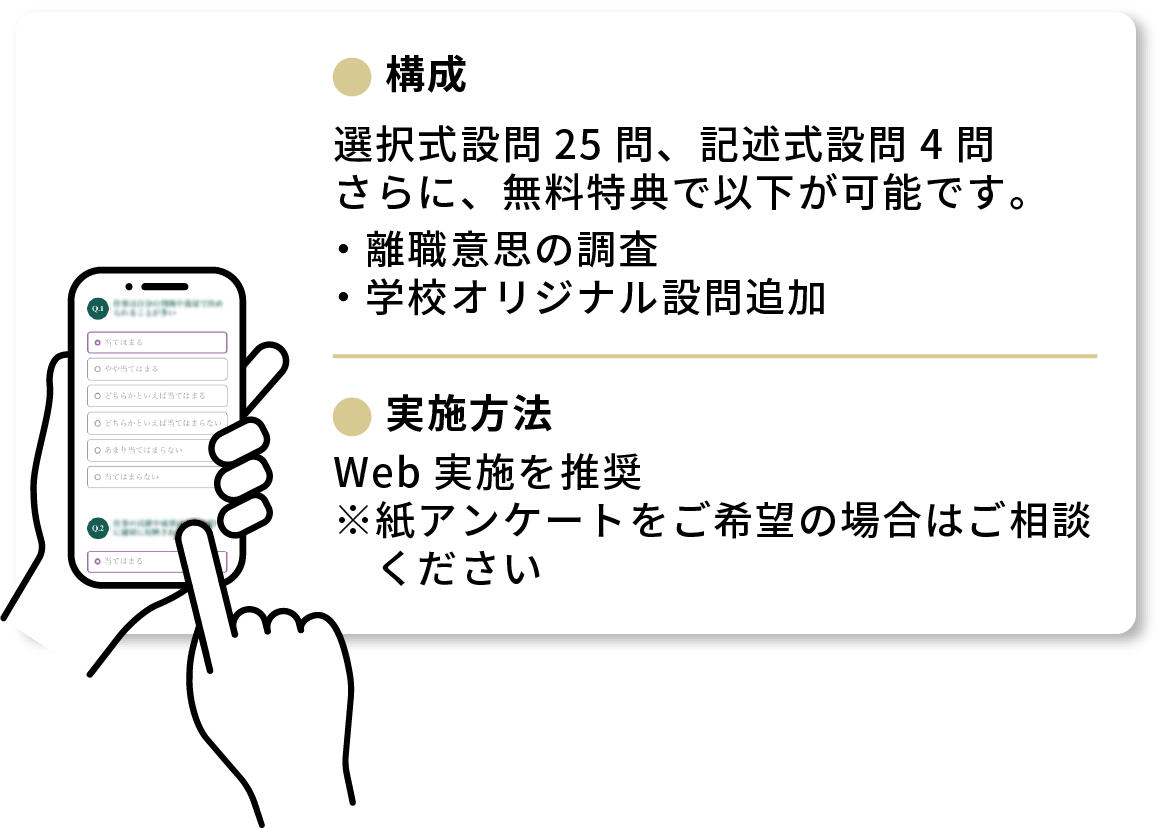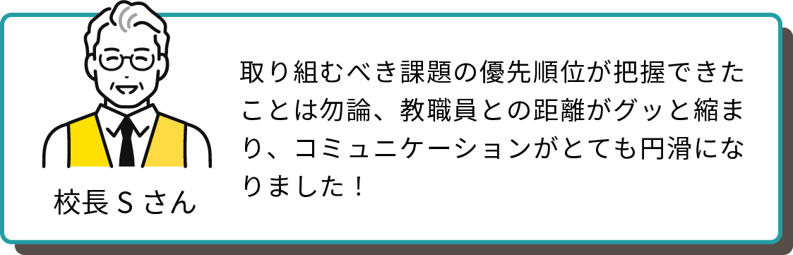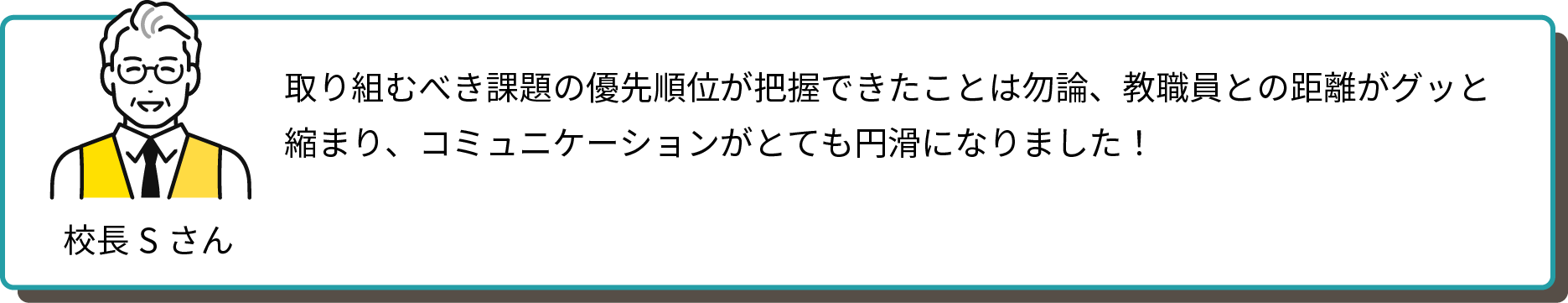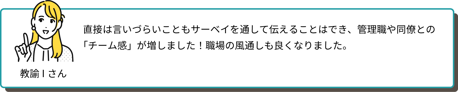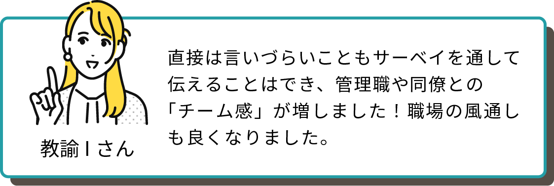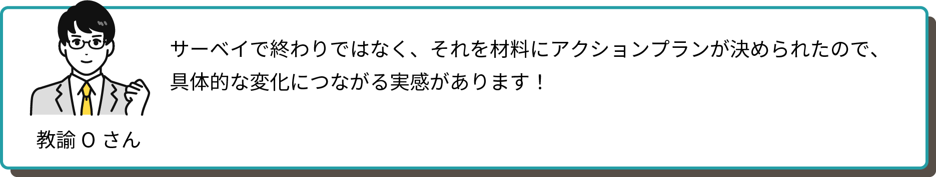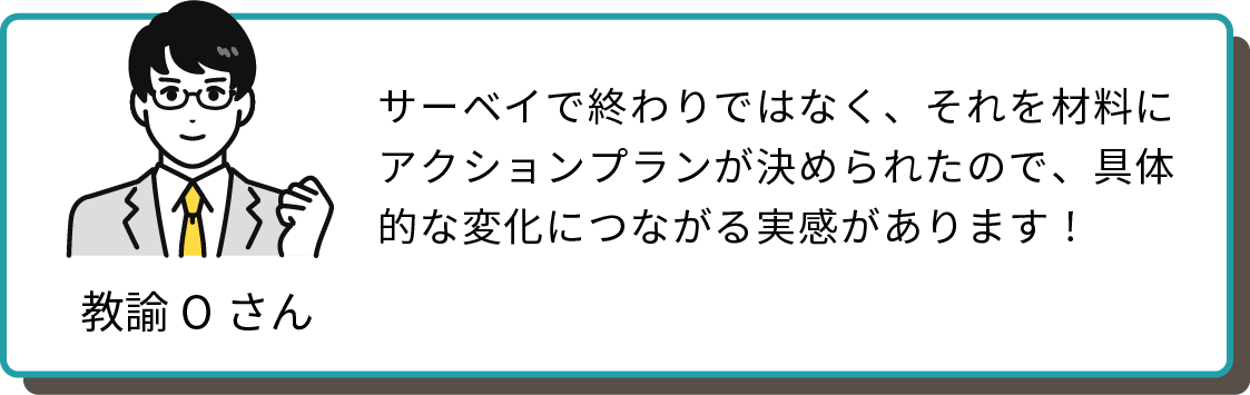 組織の管理者の感覚や声の大きい人の意見ではなく、偏りなく収集されたデータを根拠として、組織風土や職場環境の改善が進められることにより、日本の未来を担う子どもたちを支える教職員の皆様がイキイキと働けることを期待します。