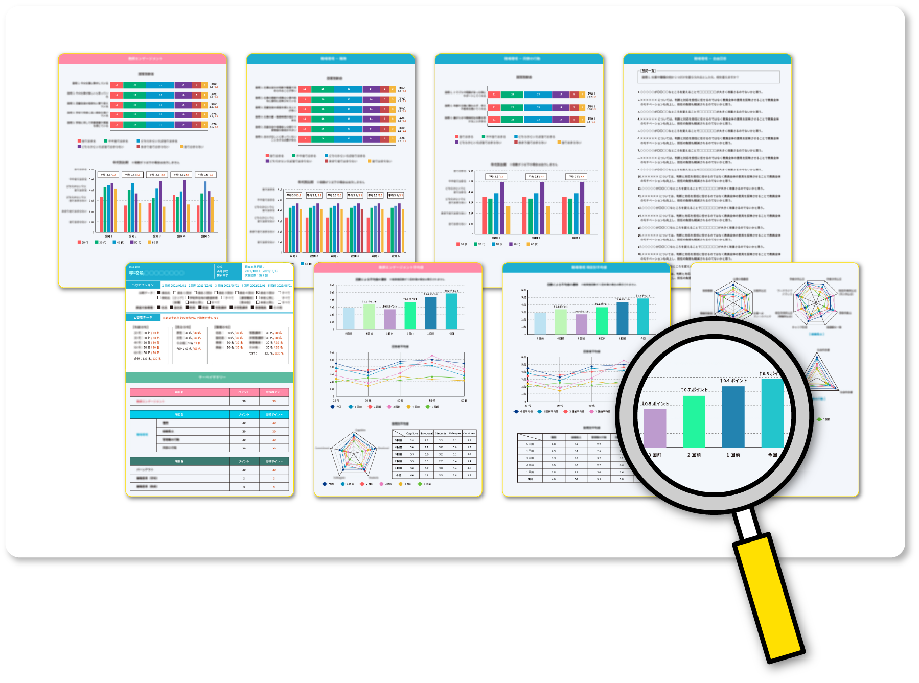 近年、主に欧米において学術研究の世界でも注目を集めつつある教師エンゲージメントに関する研究成果に加えて産業保健心理学、組織行動論といった関連分野の知見を最大限に活用して指標を開発しました。さらに、サーベイ結果から組織改善のためのフィードバックが得られる仕様です。